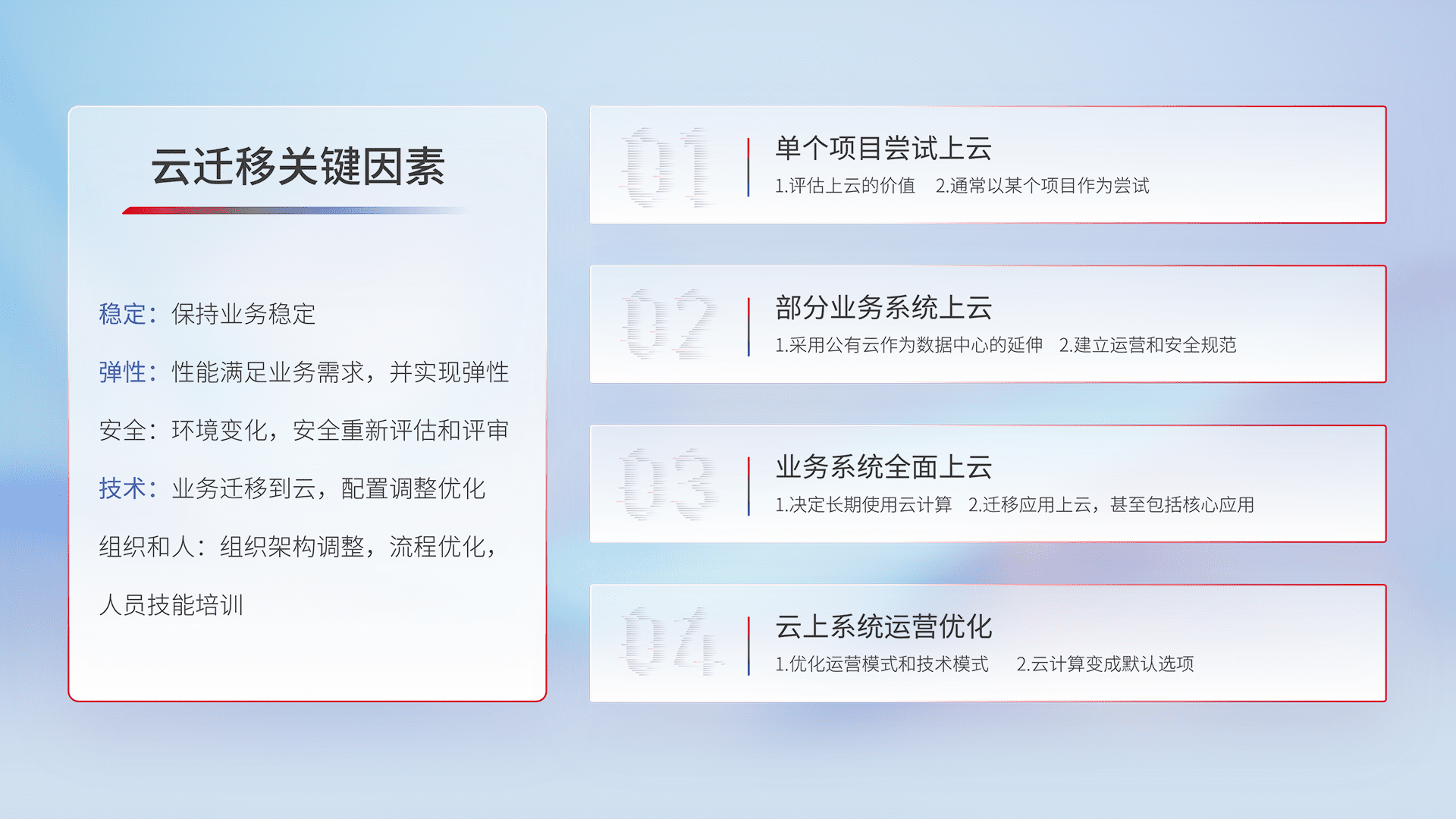 结合实际业务,,从规划设计、、、云平台选型、、、、云原生改造、、、数据迁移、、、集成交付,,,迁移全过程为客户识别最佳上云路径,,,,做好风险识别管理,,,,设计网络架构、、身份权限、、、安全审计合规、、操作审计、、、、日志审计、、监控告警策略、、、、多站点容灾设计等,,,,对云上基础设施进行整体规划,,,,提升IT治理水平,,,,以满足弹性、、、、高可用、、高性能的需求。。。