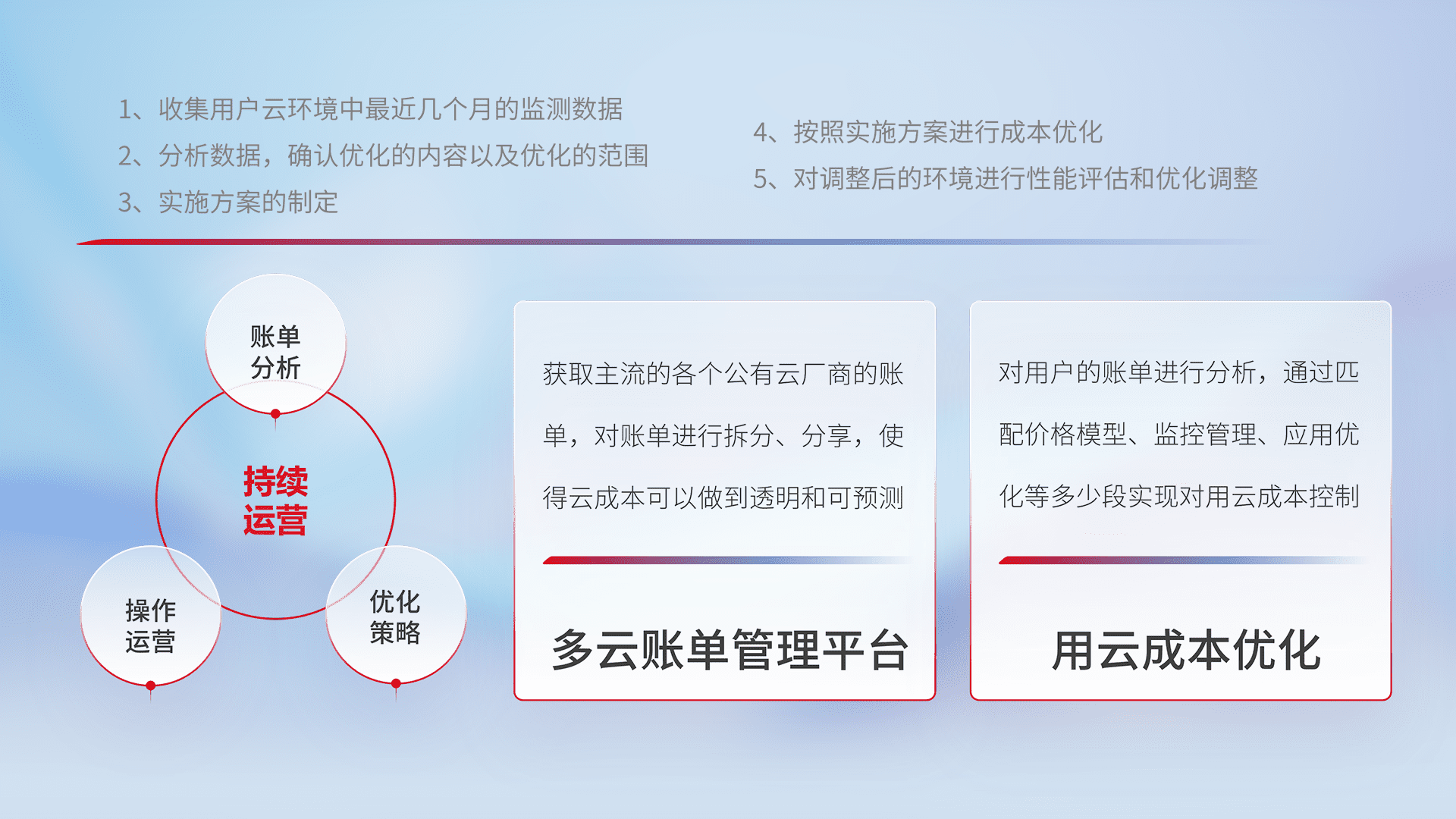 通过多云纳管,,,以统一的资源数据模型把客户的云资源进行抽象和封装,,,进而实现对多云资源的统一操作,,,,保障云资源管理的可靠性、、稳定性与可用性。。量身定制化运维内容,,,,配置、、开发运维、、补丁管理、、备份、、、、监控、、、、认证和访问管理、、、审计和日常巡检等,,保障在用云过程中的可靠度,,,稳定度以及高可用率。。。