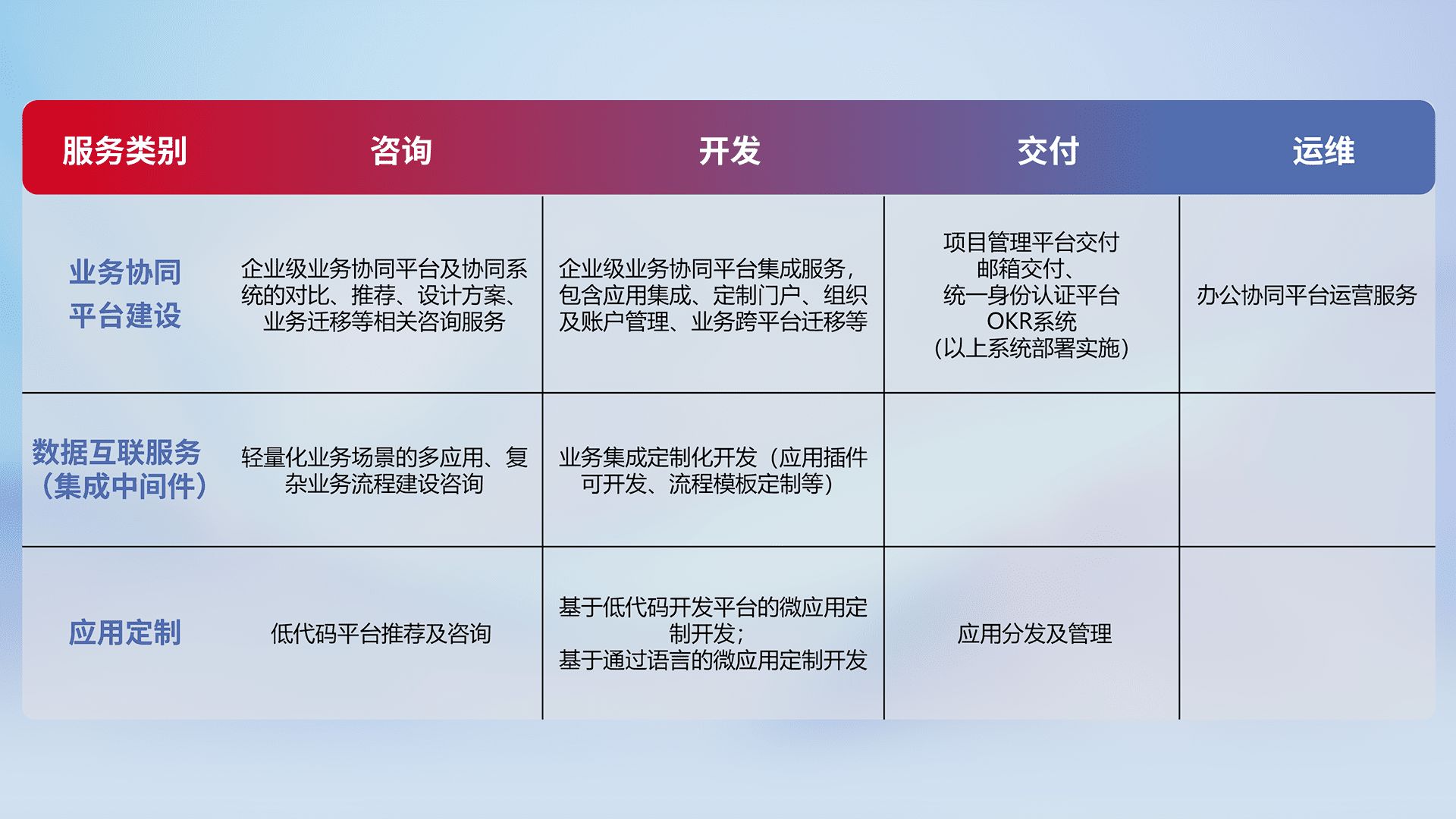 针对钉钉、、、企微、、、IDaas等平台级产品提供产品的规划、、、方案、、交付、、、定制化开发等服务,,,实现如统一协同办公、、智能客户服务、、、、混合会议管理、、智能数据查询、、、等业务场景,,实现数字化转型。。。。